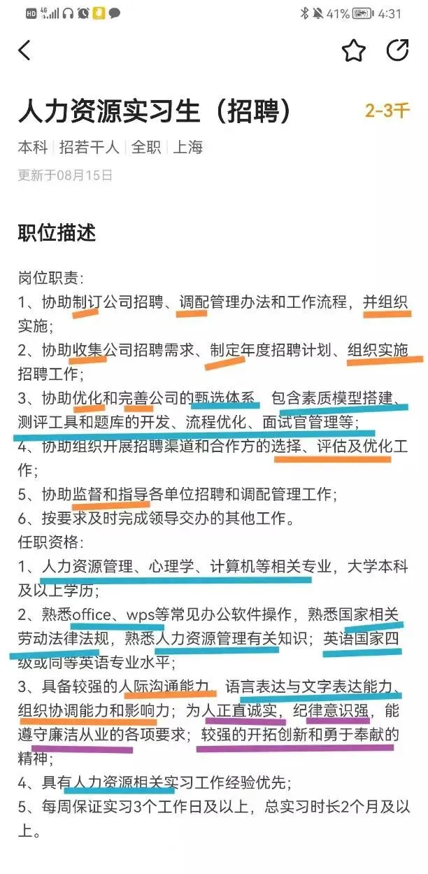 我随手在前程无忧学生版APP上搜了一个职位,以这个职位为例,我把职位中涉及到的名词、形容词、动词划出来,其实可以很明显的看出他们分别对应了专业要求、性格要求、能力要求。