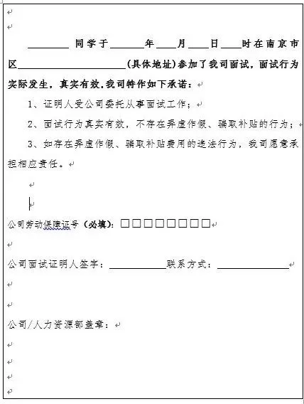 《外地高校毕业生来宁面试证明》文件为统一格式,用人单位需承诺“证明人受公司委托从事面试工作;面试行为真实有效,不存在弄虚作假、骗取补贴的行为”。还需填写公司劳保账号和证明人签字,并加盖公司印章。
