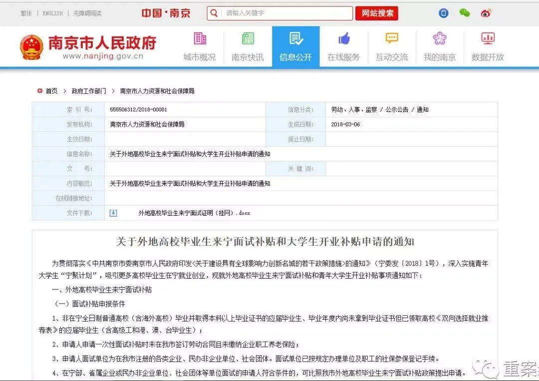 ▲3月6日,南京市人社局发布文件,对外地来宁面试大学生给予补贴。网络截图