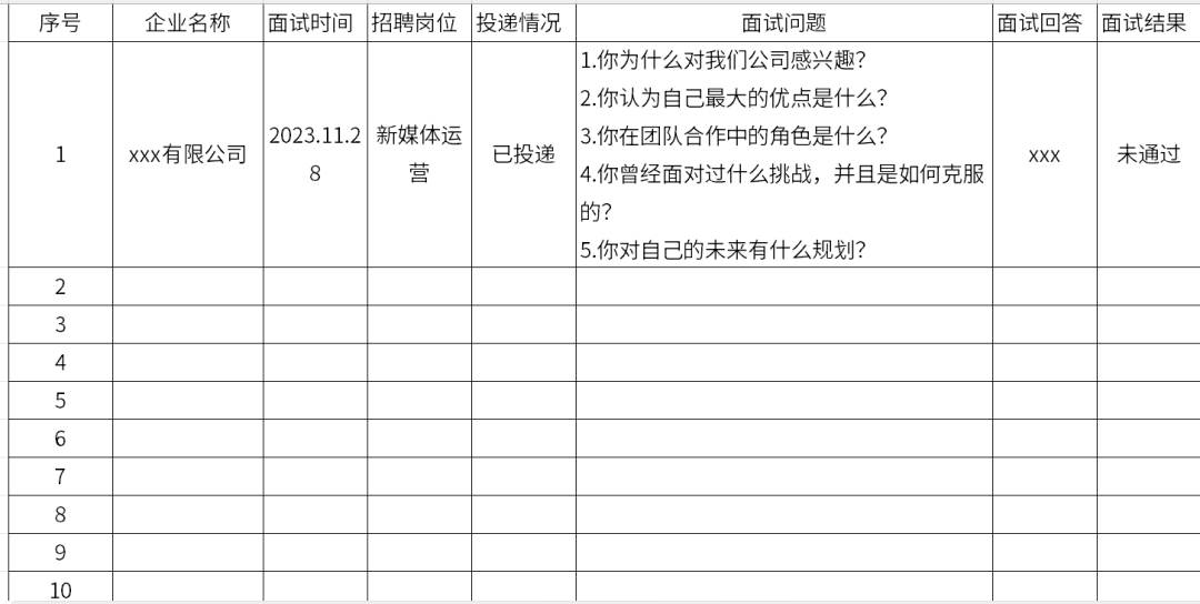 面试复盘对于提升面试技巧和准备下一次面试非常重要。你可以用Excel表格记录每次面试的详细信息,如公司名称、岗位、面试问题及你的回答等。