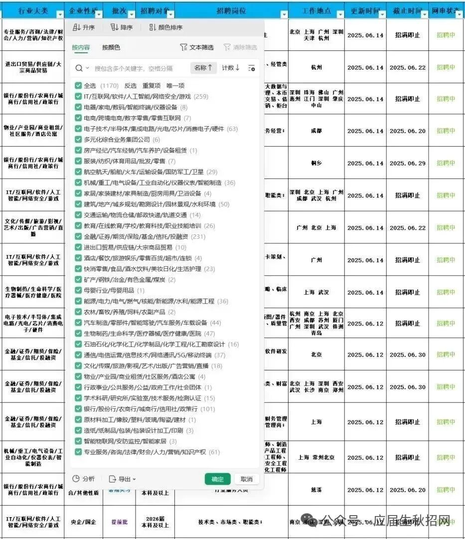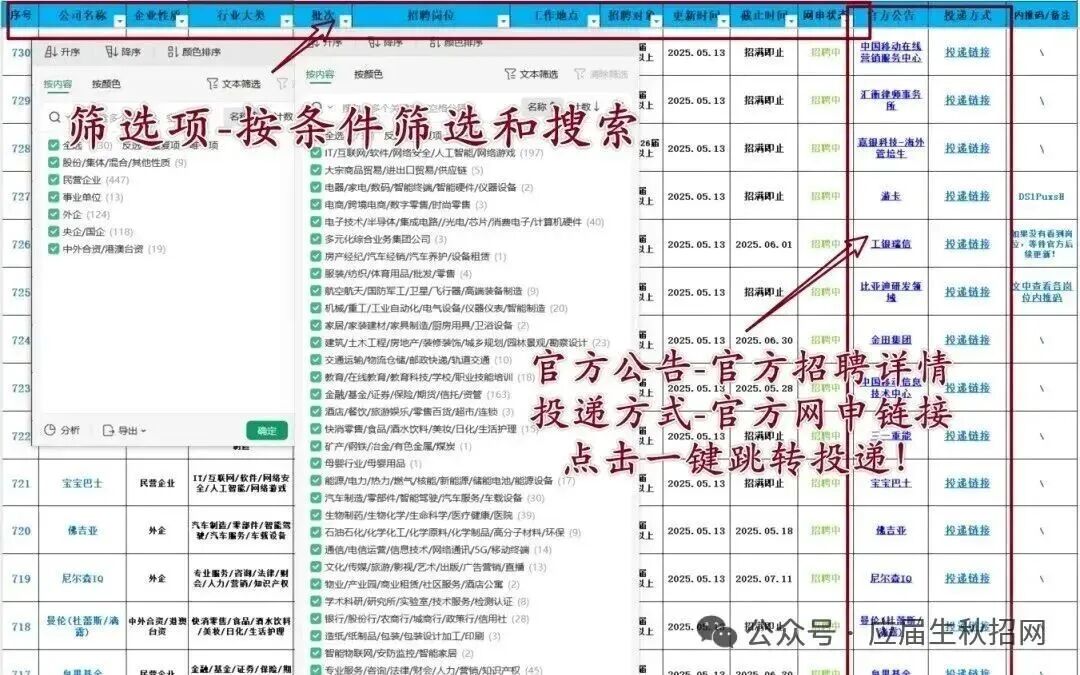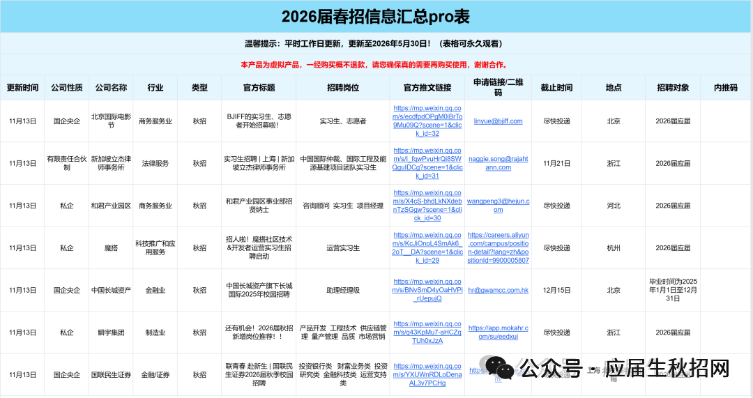1:我们对接了大量的企业HR/高管/项目负责人/项目组成员/继任招募者,委托我们发布的实习/全职招聘信息都具有非常强的时效性!每日精选10条以上当日实习信息,会员专属!2:我们会定期整理汇总表,分时间:春招/秋招网申汇总表、寒暑假实习信息汇总表、远程实习信息汇总表等...分行业:国企央企汇总表/金融/咨询/互联网/事务所/快消岗位汇总表/国家部委招聘信息等等,每周第一时间分享到VIP会员群!部分展示示如下👇2025-2026年度会员将获得25个+招聘汇总表权益,每个表格将持续更新到周期结束覆盖行业全面:银行/证券/基金/保险/期货/互联网/电子商务/计算机软件/通信/国家机关/高校/研究所/事业单位 /教育/会计师事务所/咨询公司/法律/消费品/零售/服装/家具/贸易/制造业/汽车/电子/电器/机械/石油/钢铁/电力/能源/煤矿/化工/生物/制药/医疗/农林/畜牧/媒体/广告/旅游/公关/文化/影视/酒店.........个性化筛选:所有信息均支持自主筛选,行业-企业-截止时间-投递链接-工作地点…,分门别类,一目了然,既能海投,又能精准投递。每周校招截止提醒⏰:每周截止校招专属提醒,不错过任何一个机会!包括国央企、事业单位、民企、外企、合资企业......。