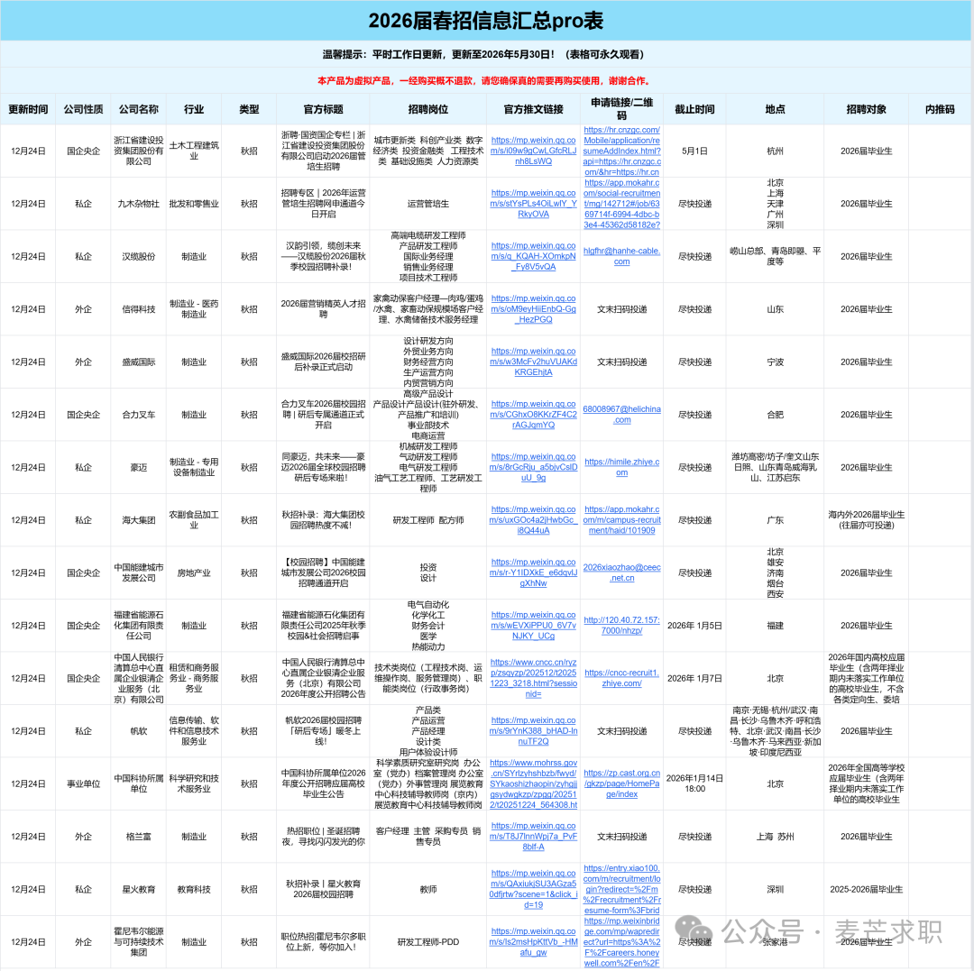 其实还有很多大厂刚刚开启2026秋招返厂补录,正在大力捞人!👉快消/互联网/金融咨询/央国企/新能源等行业都放出大量岗位,如果你还没有挑选到心仪的企业,不知道都有哪些企业开放秋招补录,来年也没时间去网上找春招信息,如果你想把更多的时间精力留给笔试面试,省时省力网申,小编强烈推荐你领取:包括国央企、事业单位、私企、外企、合资企业,全行业类型!涵盖互联网/金融/科技/制造业/咨询/快消/医药/地产/教育/文娱等行业❗本汇总表为在线文档,订阅需申请权限,不支持表格下载/编辑/复制,介意勿订!❗本汇总表供学生校招网申投递使用,家长如若购买,请让学生申请权限,除非家长自己使用!