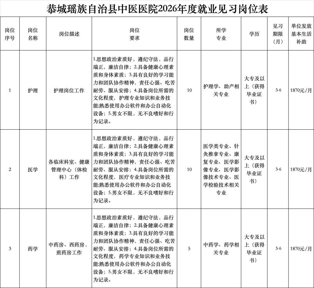 具体招募见习岗位信息详见附件《恭城瑶族自治县中医医院2026年度就业见习岗位表》。