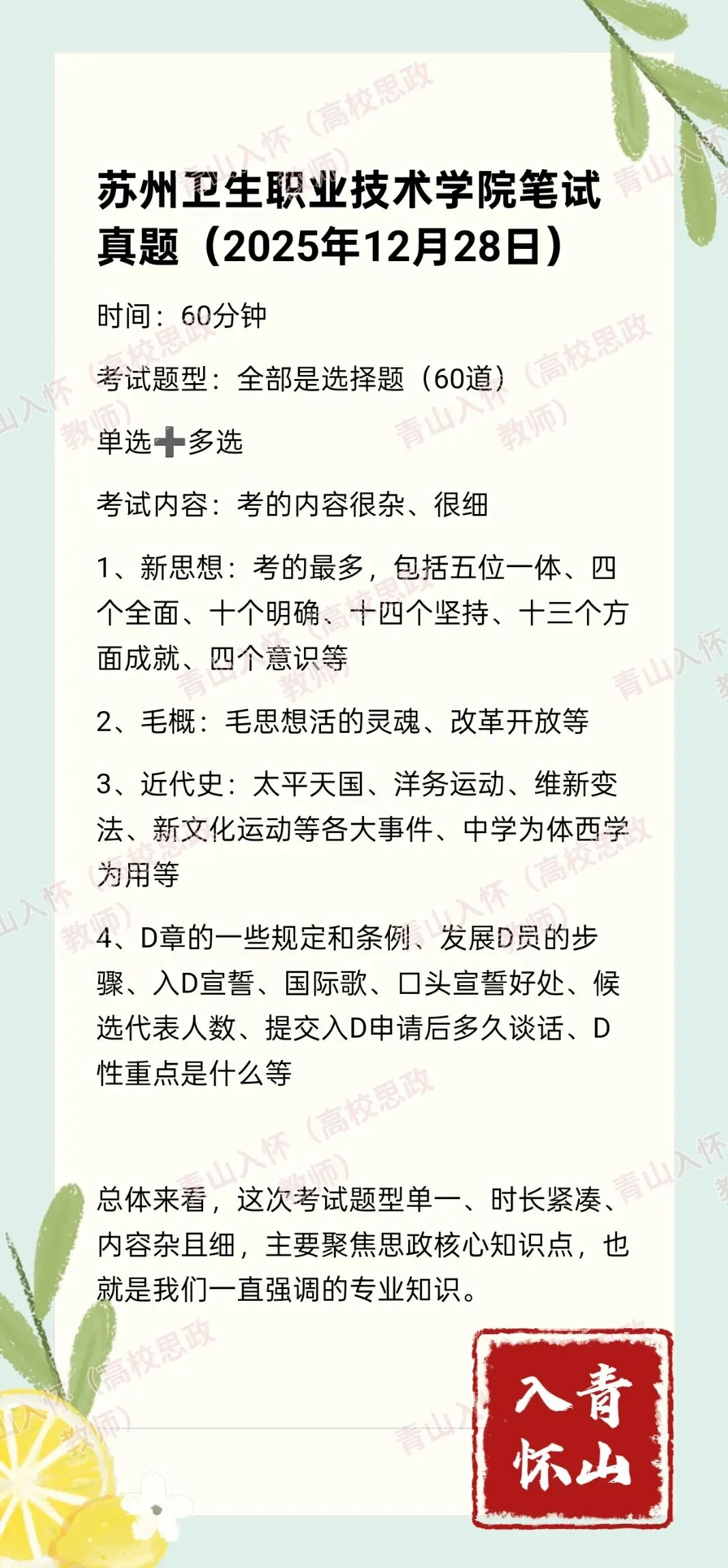 苏州卫生职业技术学院思政教师笔试真题(2025年12月28日)