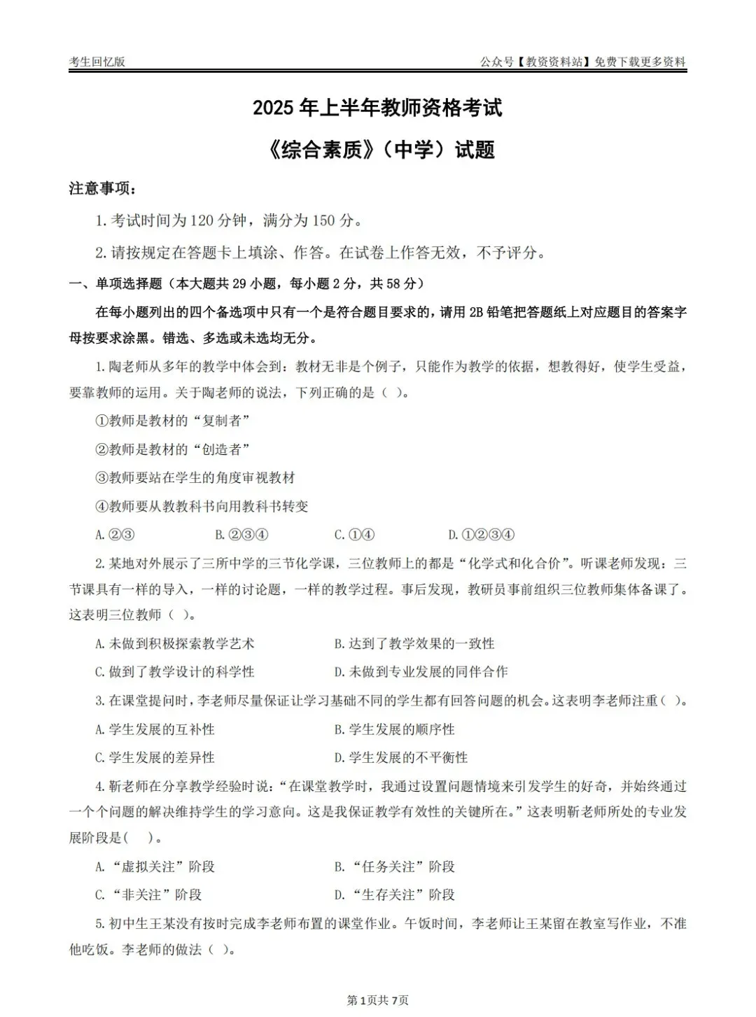 2025年上半年教师资格证考试《综合素质》(中学)笔试真题.pdf