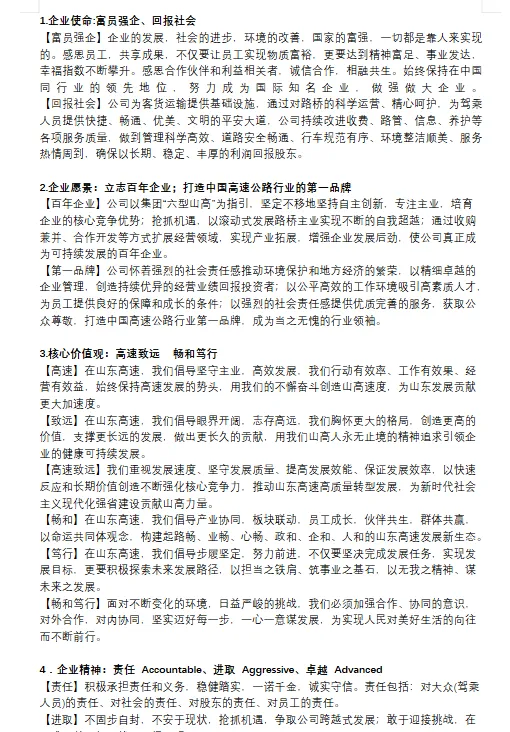 山东高速特色(约 5-8 题):集团改制背景、核心业务(高速建设 / 运营 / 物流 / 金融)、企业文化(如 “九个再突破”)、重大项目与新闻。
