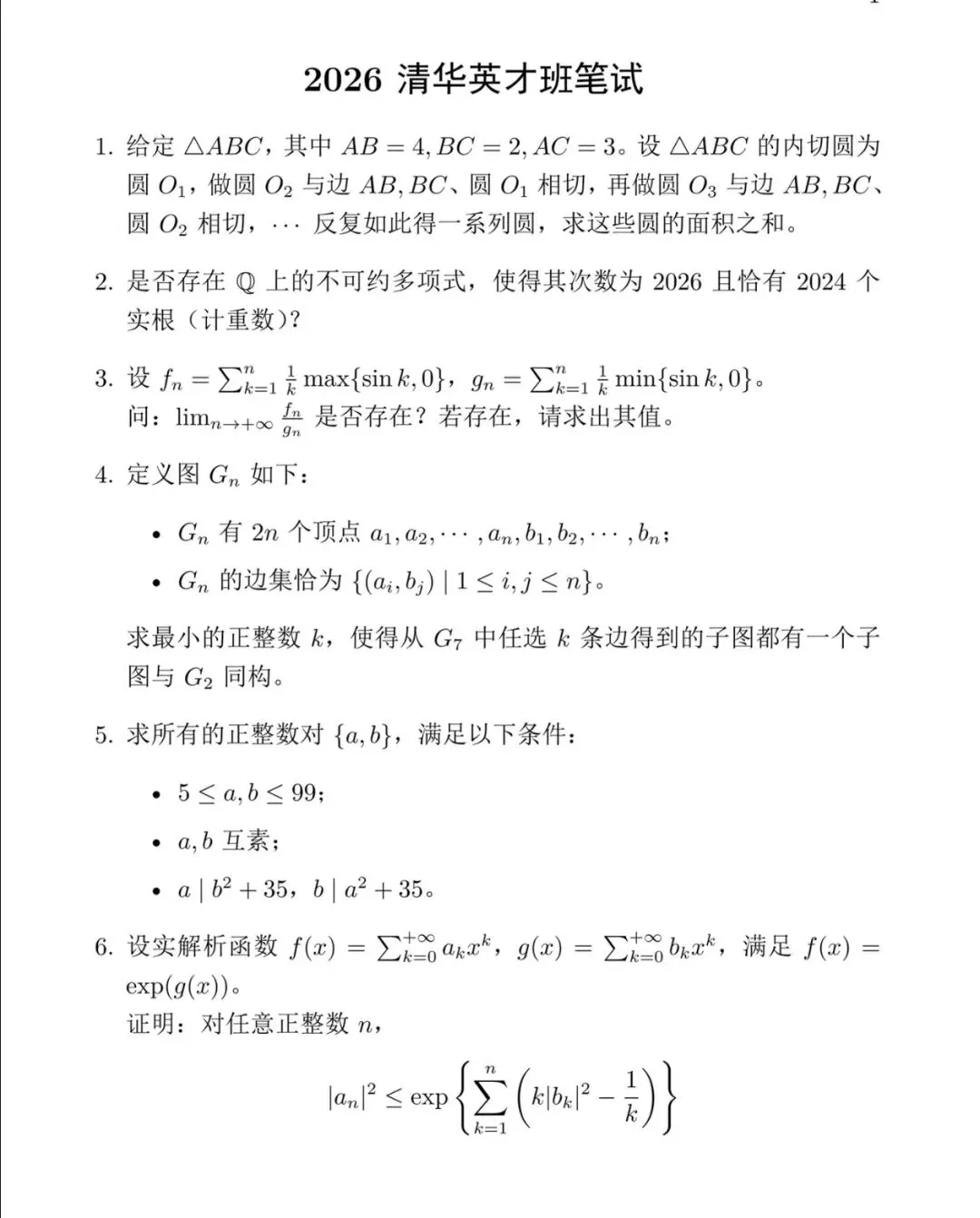 2026年清华丘成桐数学英才班笔试真题发布1、平面几何2、多项式3、数分4、图论5、数论6、实解析函数竞赛内容和高等内容各占一半左右,分值是15*4+20*2,难度比去年有增加,祝各位考生顺利进面。