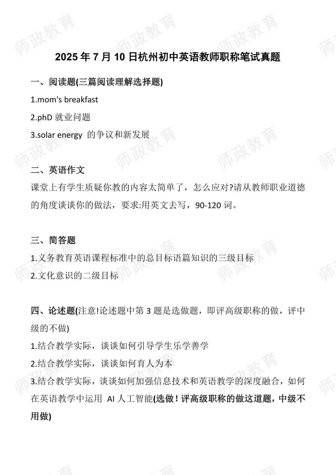 2025.7.10杭州市初中英语教师职称考试笔试真题