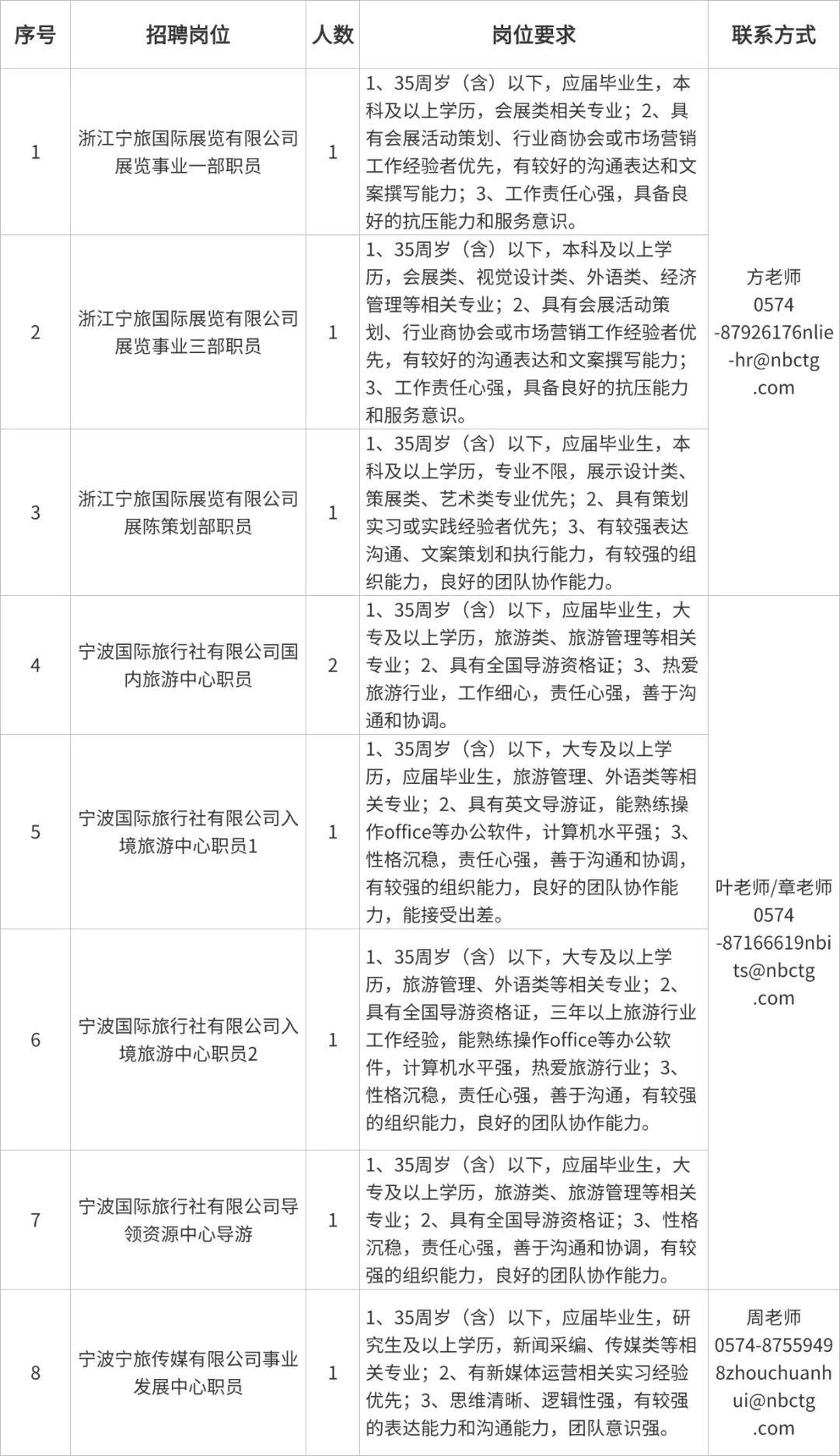宁波文旅会展集团有限公司因工作需要,现对社会公开招聘人员,具体如下: