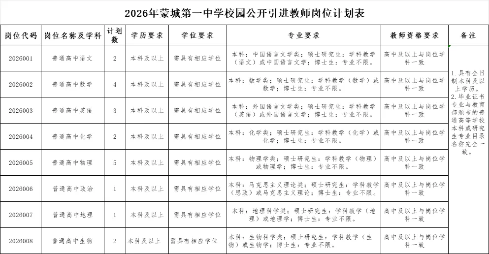 1.2026年蒙城第一中学校园公开引进教师岗位计划表