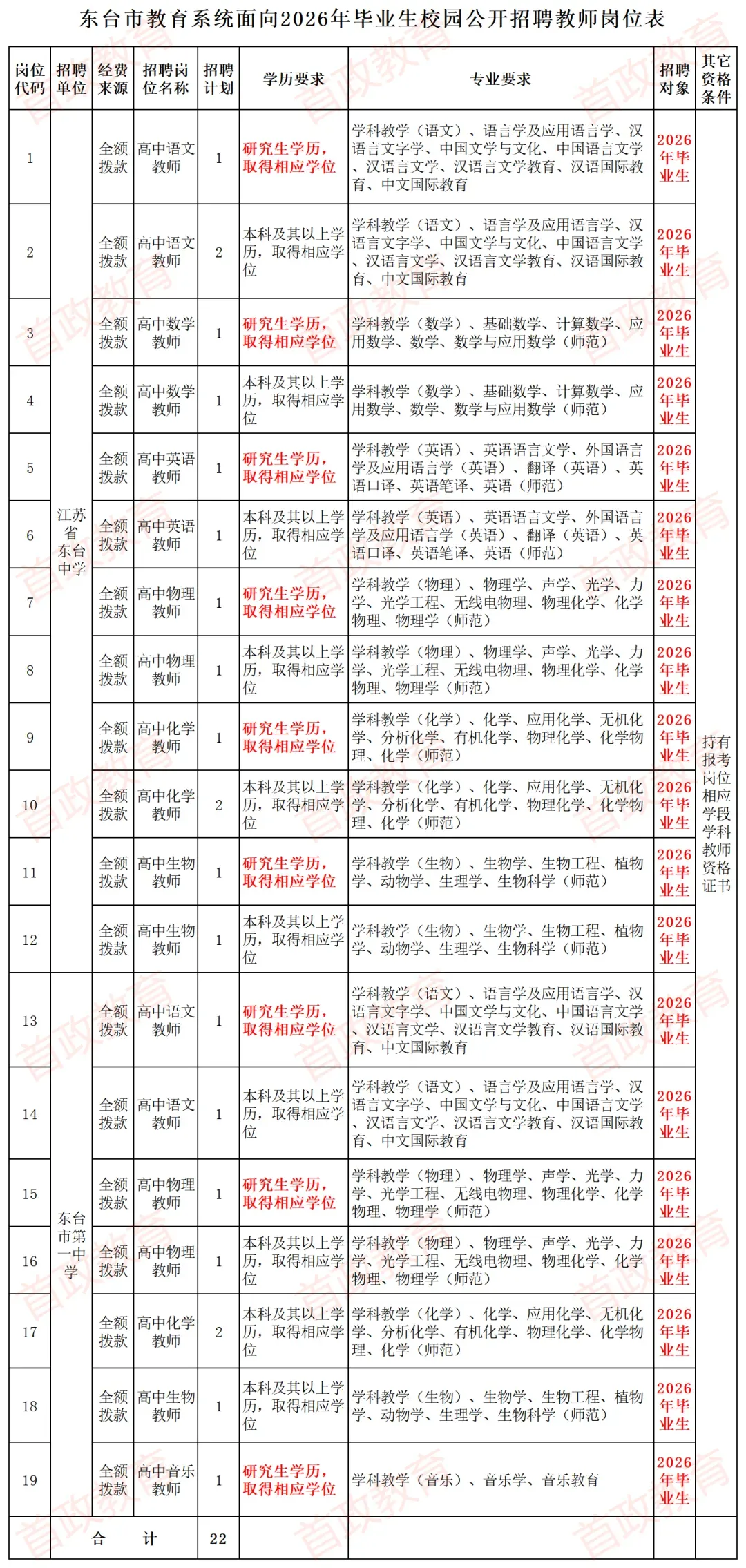 为贯彻落实人才强市战略,东台市教育系统拟面向2026年毕业生公开招聘部分学科教师22名。现公告如下: