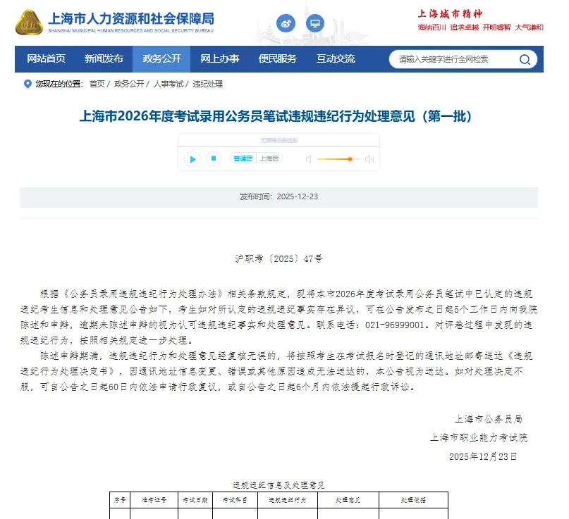此前,上海市公务员局与上海市职业能力考试院联合发布了《上海市2026年度考试录用公务员笔试违规违纪行为处理意见(第一批)》。51名考生因违反考试纪律被严肃处理,所涉科目成绩直接归零。