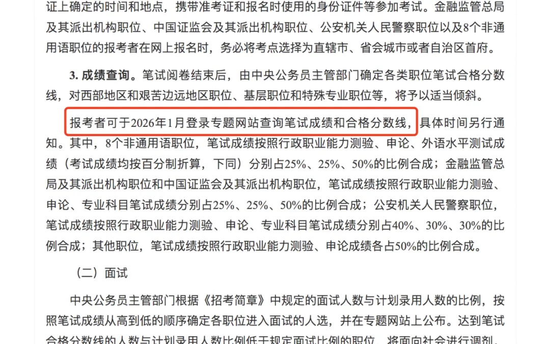 在《中央机关及其直属机构2026年度考试录用公务员公告》中提及到到成绩查询时间:报考者可于2026年1月登录专题网站查询笔试成绩和合格分数线,具体时间另行通知。