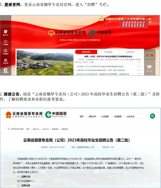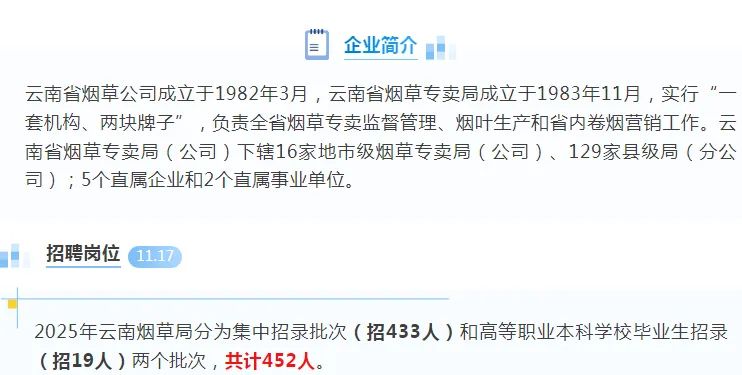 招聘岗位:专卖局的烟叶综合管理岗、烟叶生产收购管理岗、生产技术岗;玉溪、楚雄、大理、昭通卷烟厂生产操作岗-植物生产类
