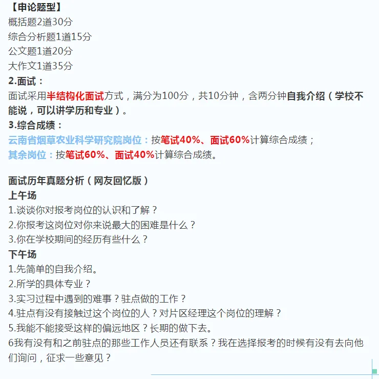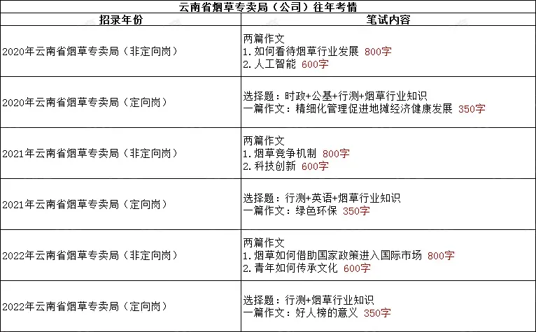 备考小建议:云南中烟自2020年改革实施统考后,每年的题型题量变化不大,都是考察行测+小作文+专业知识。