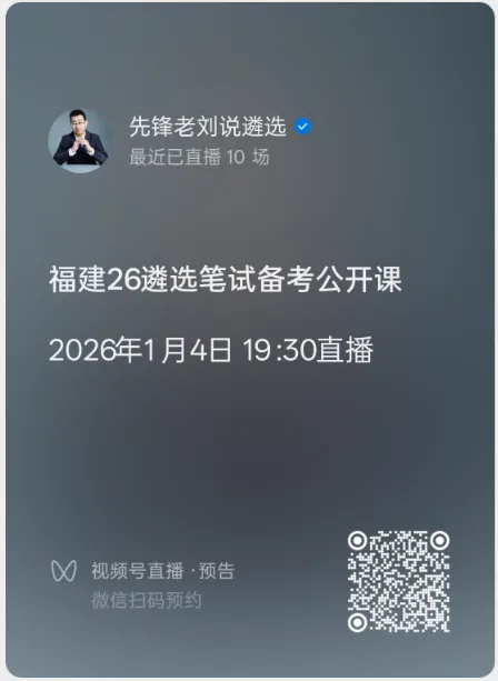今晚7点30,先锋刘教授讲了,2026年福建遴选笔试备考公开课,分析福建遴选笔试考情、真题精讲等,全是干货,快来扫码约课吧~
