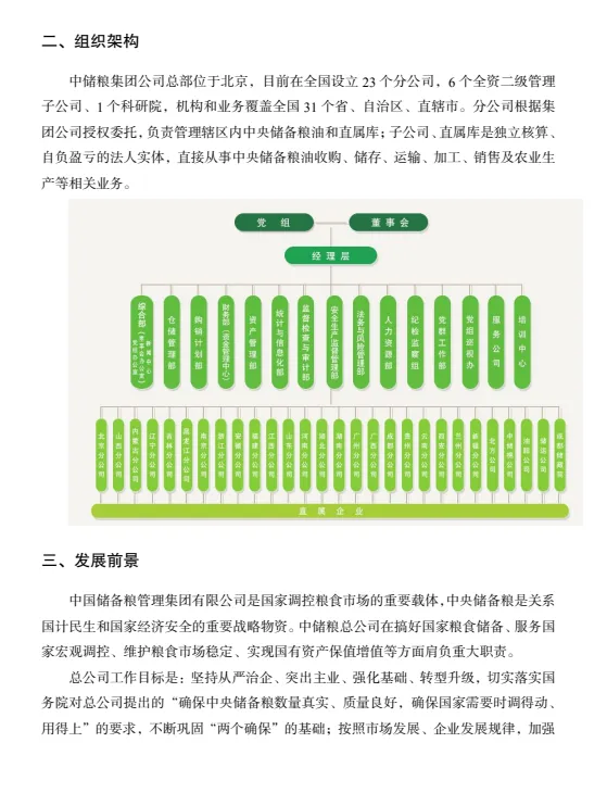 业务与架构:三级架构、智能化粮库建设、绿色储粮技术应用、储备粮轮换政策。