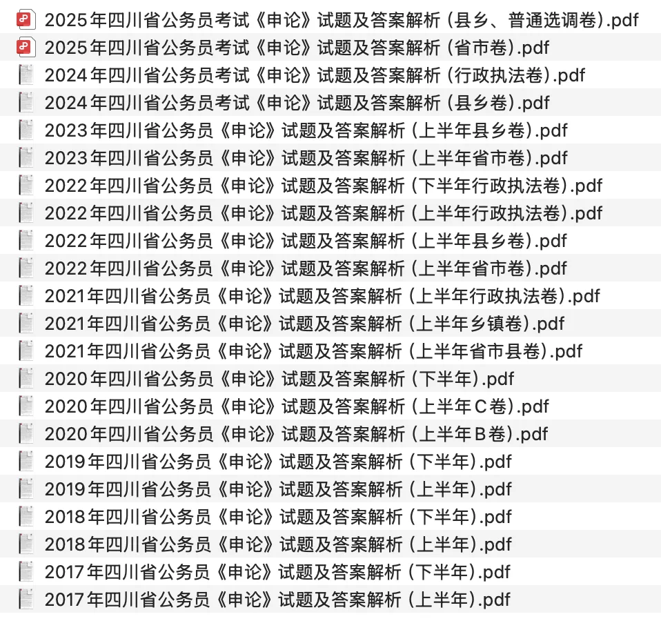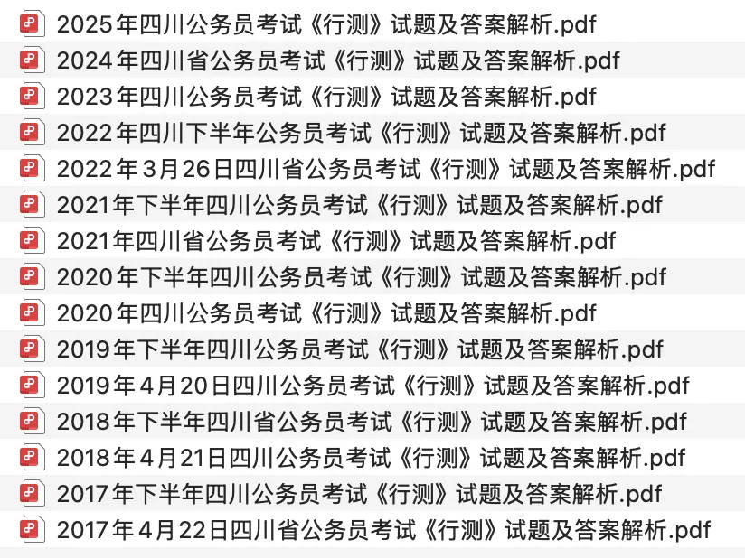 历年四川公务员考试笔试真题汇总:包含2017年—2025年四川省公务员考试笔试真题,包含行测15套+申论20套,试题有答案和解析,后附有目录和部分内容截图。试题来源于考生回忆及网络整理,部分试题可能不完整,仅供学习参考。