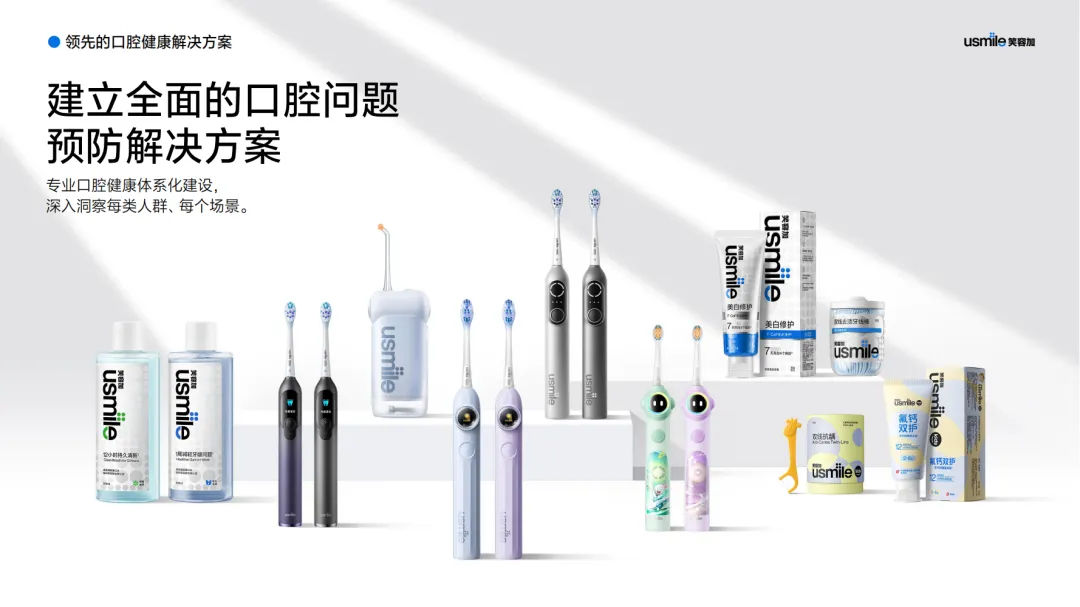 公司的主力品牌——“usmile笑容加”秉承“预防大于治疗”的价值理念,凭借革新性的数字化技术,笑容加已跃升为中国牙刷市场份额第一的品牌,累计服务超6500万名用户,产品销往全球30多个国家和地区。