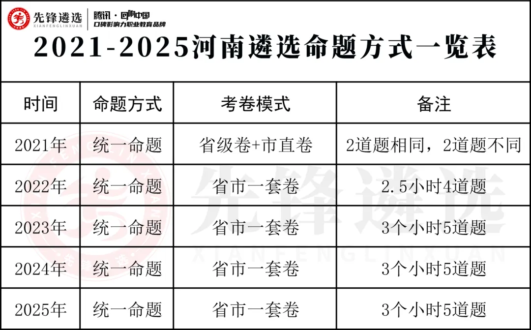 从命题演变看,河南遴选经过了“1+N”“1+1”“1”三种命题方式,逐渐由独立命题转变为统一命题。2019年之前,河南省市遴选分开命题;2020年因疫情原因,没有组织遴选考试。2021年,省市虽然统一命题,但是省、市是两套卷子,4道题中有2道题是不同的。从2022年至今,省市统一命题,而且采用同一套卷子。详见下表: