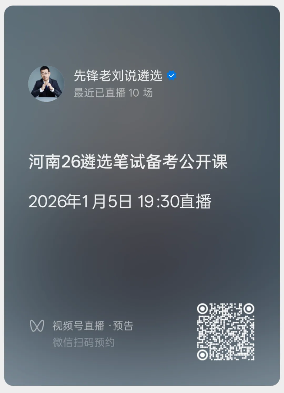 今晚7点30,先锋刘教授讲,2026年河南遴选笔试备考公开课,分析河南遴选笔试考情、真题精讲等,全是干货,快来扫码约课吧~