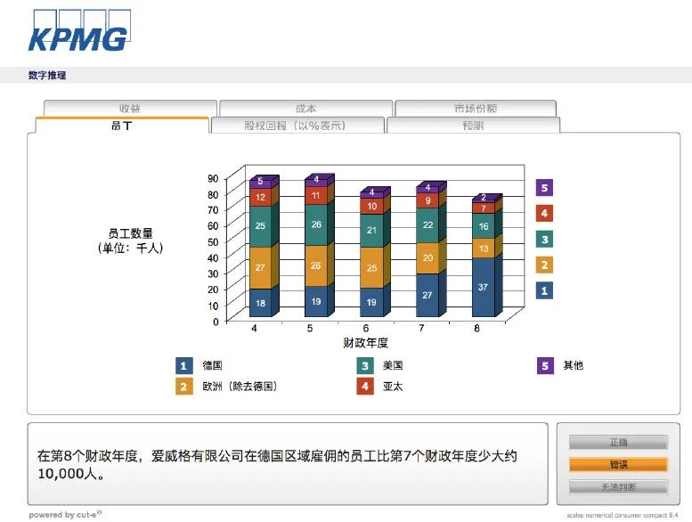 麦肯锡的笔试叫做McKinsey Problem Solving Test包括3个案例,每个案例10题左右,总共30题左右。整套题是ETS出品,一个Case的阅读量大概是1/3 A4纸 ,然后每道题目都会根据Case来出10道左右的问题,涉及若干计算、估计、数据图表分析、图表、判断等题目。