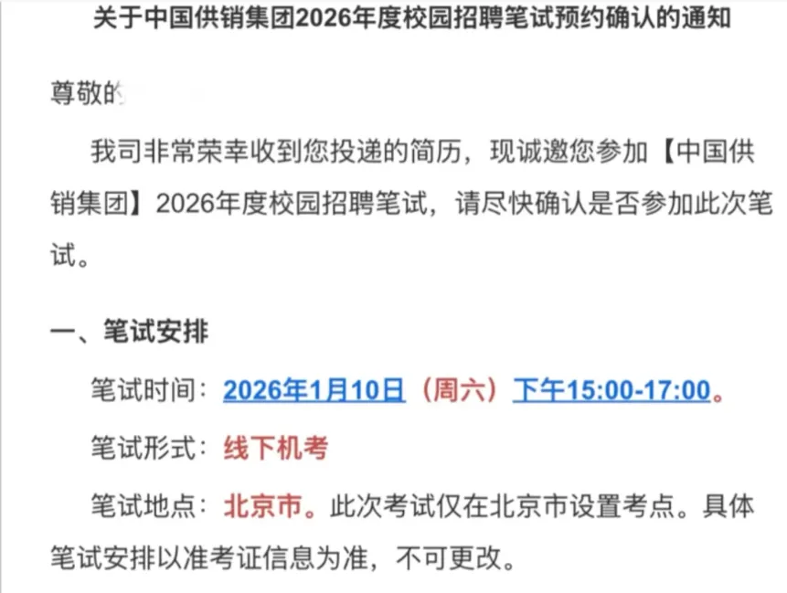 中国供销集团本次校招笔试安排在 1 月 10 日 15:00-17:00,采用线下机考形式,考点仅设在北京,需提前确认行程并准备准考证。考试时长 2 小时,题量约 120 道客观题,整体命题贴合国企招聘的 “综合能力 + 行业适配性” 特点。