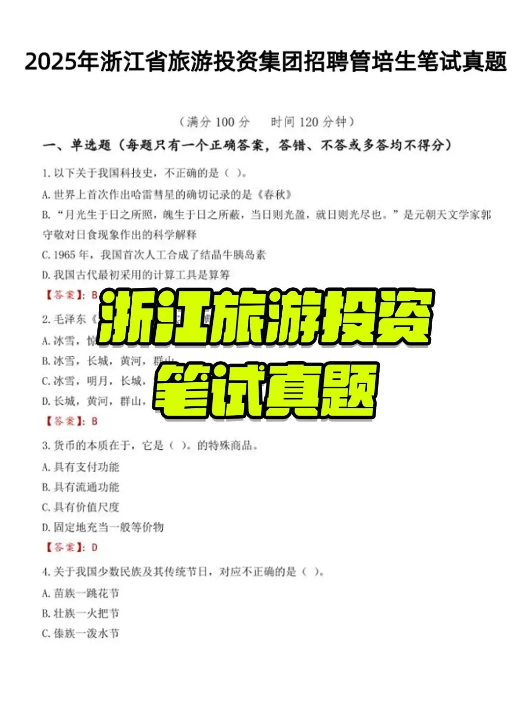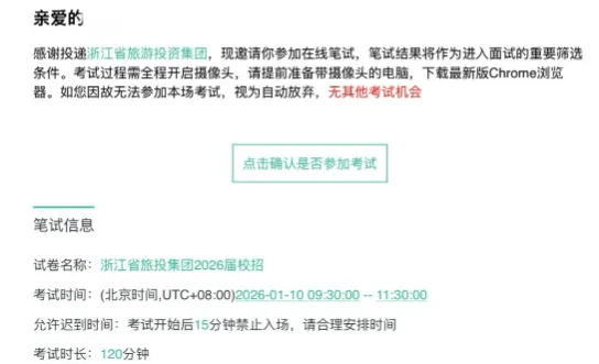 浙旅投本次笔试时间为 1 月 10 日 09:30-11:30,时长 120 分钟,题型以客观题为主,部分岗位含专业主观题,整体题量约 100 道,需注意答题节奏。