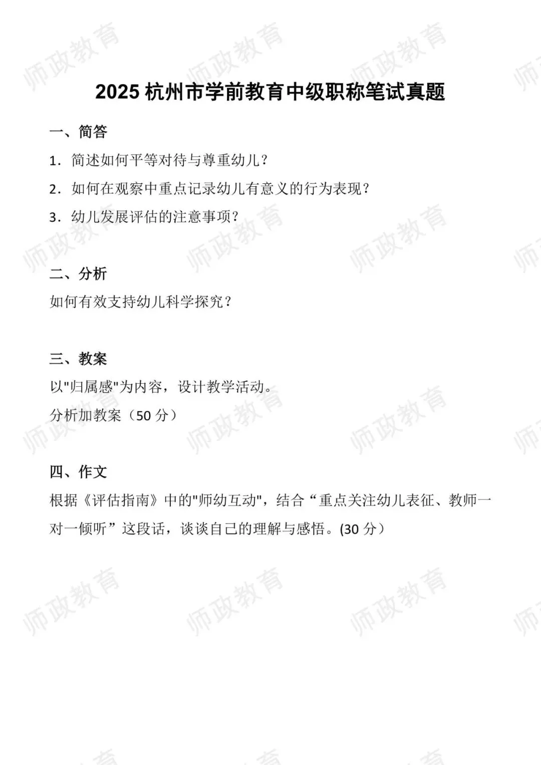 >2025杭州市学前教育中级职称笔试真题