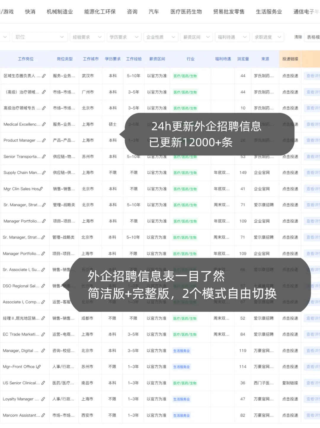 -外企新开岗位表,已更新12000+招聘机会,涵盖新一线、一线、二线等城市,可以筛选岗位要求、地区、企业等等...