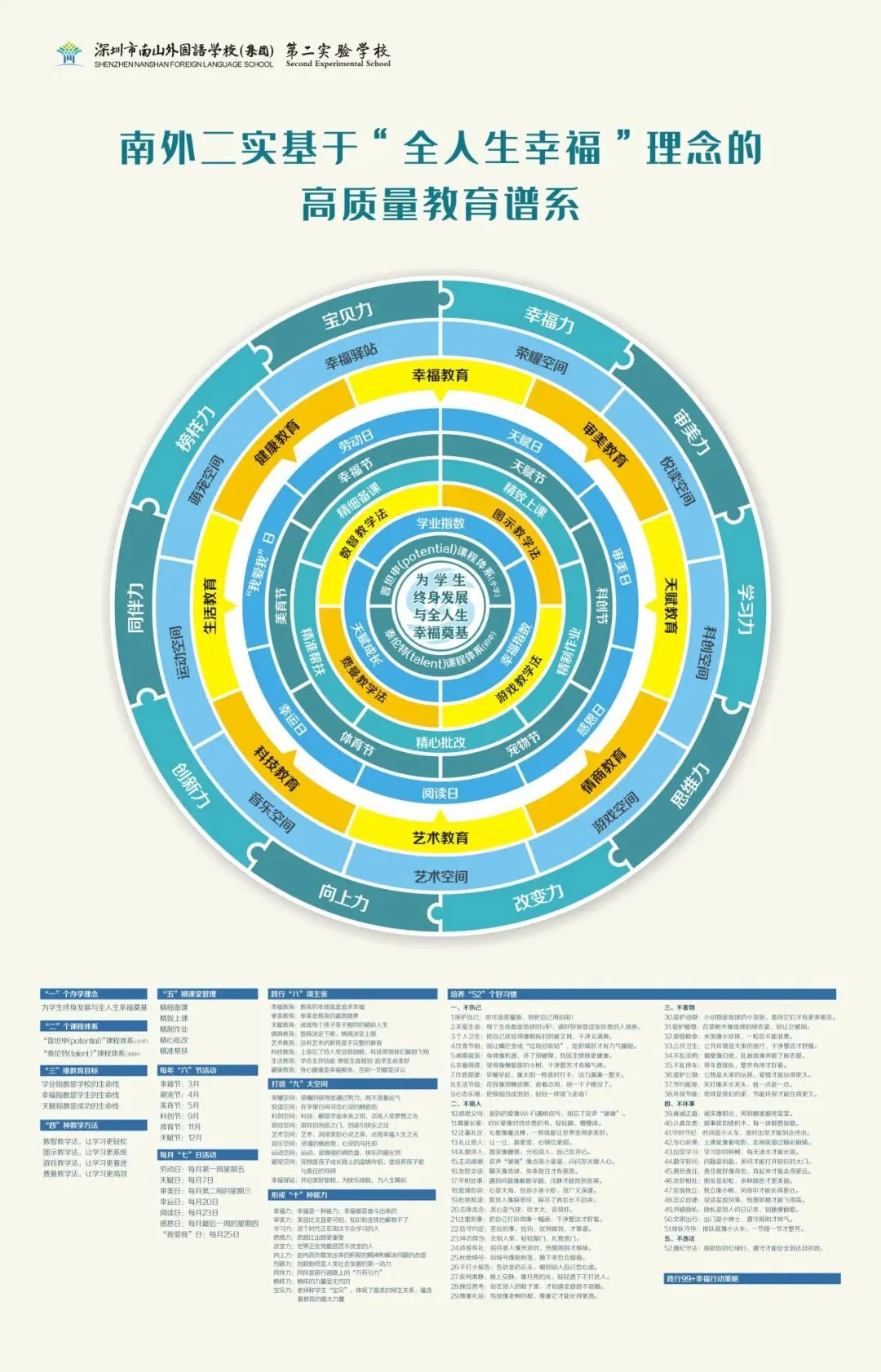 通过“一”个办学理念,“二”个幸福相约,“三”维教育目标,“四”化教学策略,“五”精教学课堂管理,每年“六”节活动,每月“七”日活动,践行“八”项主张,形成“九”种能力,围绕“十”种积极情绪,培养学生52个好习惯,践行99+幸福行动策略等,逐步形成了南外二实基于“全人生幸福”理念的高质量教育谱系,努力把学校办成“教育教学质量优、师生幸福指数高、学生天赋得到充分发展”的国际一流的优质学校。