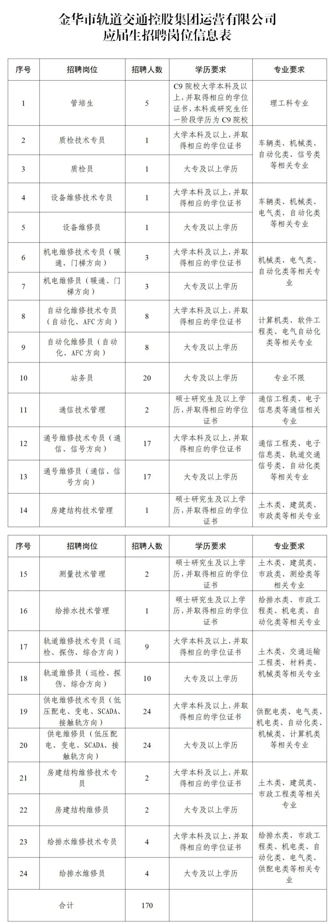 本次招聘岗位共24个,招聘人数170人,具体招聘岗位及专业要求详见《金华市轨道交通控股集团运营有限公司应届生招聘岗位信息表》。