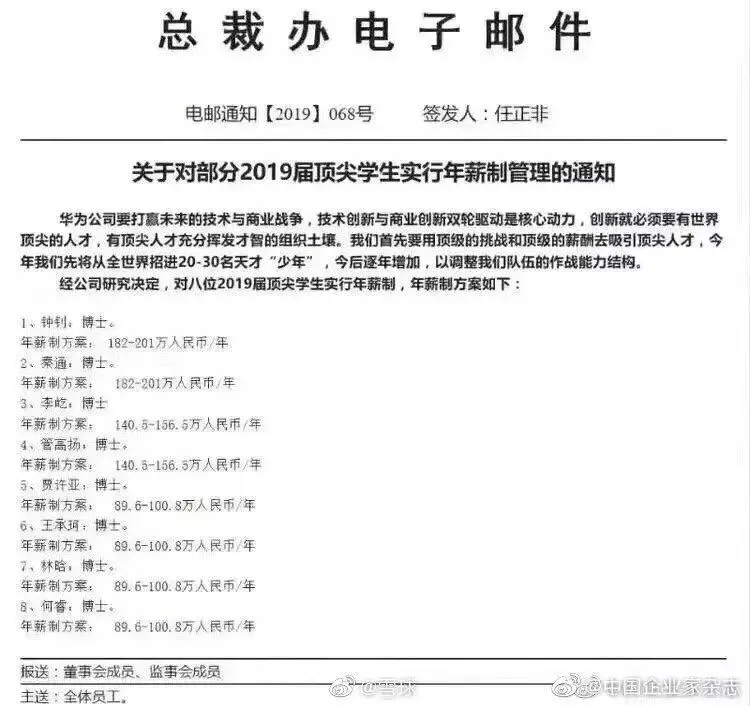 而对于高材生,华为一向都是非常重视的。据@雪球、@中国家企业家杂志晒出的截图看,华为总裁办签发的最新电子邮件显示,华为对部分2019届顶尖学生实行年薪制管理,年薪为100万~200万元不等。
