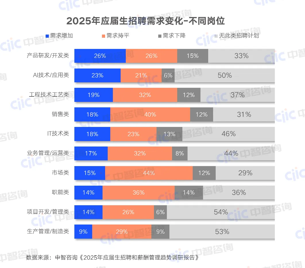 值得关注的是,AI相关岗位起薪有优势。42%企业设有AI岗位,近两成企业该类岗位应届生起薪高于同学历一般岗位,技术人才的薪酬溢价持续凸显。