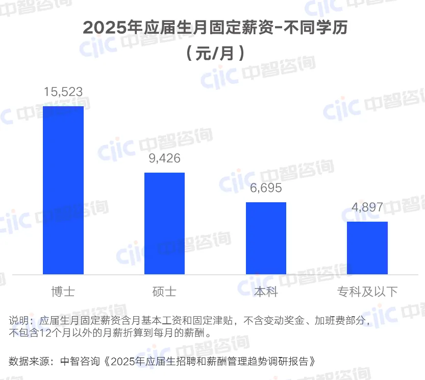 从市场整体起薪水平看,博士月均15523元、硕士9426元、本科6695元、专科4897元,不同学历之间差异显著。