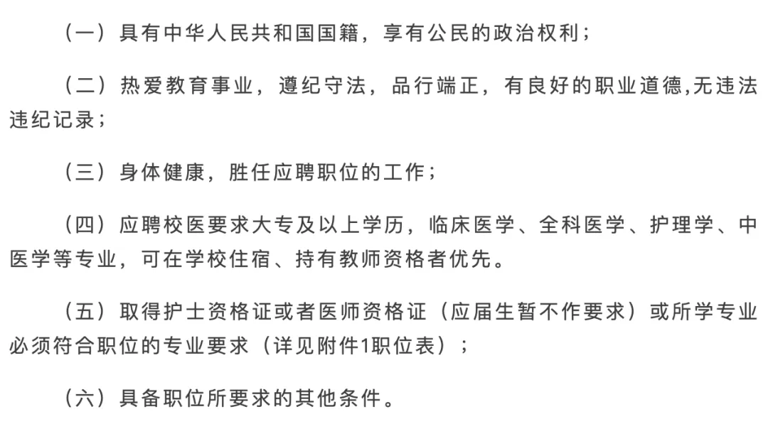 应聘校医要求大专及以上学历,临床医学、全科医学、护理学、中医学等专业,可在学校住宿、持有教师资格者优先。取得护士资格证或者医师资格证(应届生暂不作要求)或所学专业必须符合职位的专业要求