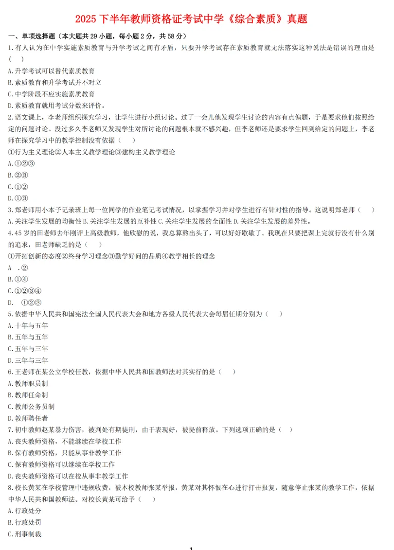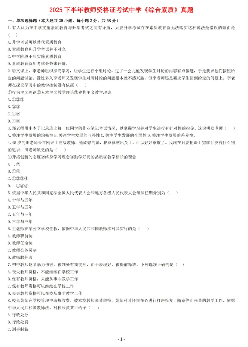 中学-教资笔试历年真题(2025下)