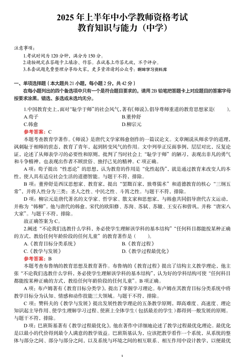 教资笔试-历年真题|2012年-2025年笔试科目一、科目二真题汇总