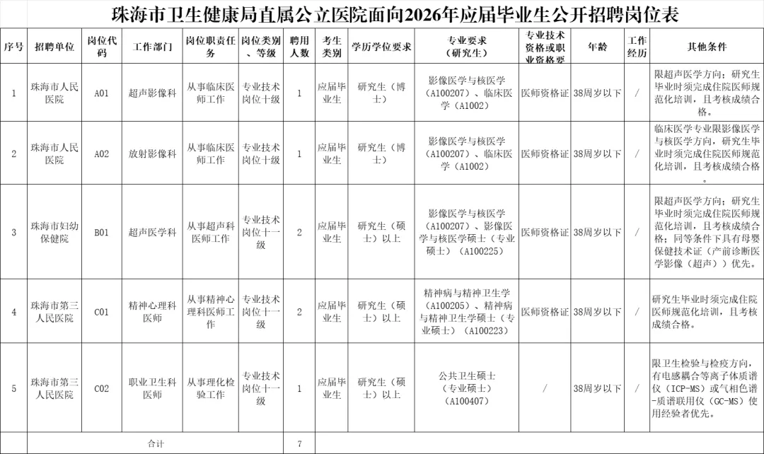 根据《事业单位人事管理条例》(国务院令第652号)《广东省事业单位公开招聘人员办法》(省人民政府令第301号)和有关规定,我局所属3家公立医院面向全国2026年应届毕业生公开招聘工作人员7名。现将有关事项公告如下: