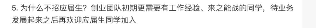 王腾的表述大概意思就是,他们是创业团队,初期需要有相关工作经验的人,“来之能战”,不是来给你学经验的,而是需要每个人都能扛起初创公司的大旗。不过王腾也表示,之后公司业务如果发展起来,会招收应届生。
