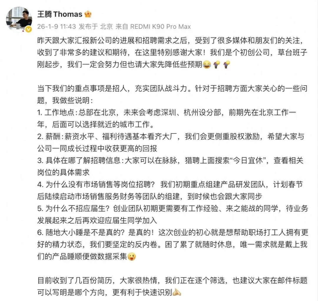 1月9日,原小米中国区市场部总经理、REDMI品牌总经理王腾在官宣成立新公司“今日宜休”后,针对于招聘方面大家关心的一些问题做出说明。王腾表示,公司初期重点组建产品研发团队,计划春节后陆续启动市场销售服务财务等团队的组建。而针对为何不招应届生,他表示,“创业团队初期更需要有工作经验、来之能战的同学,待业务发展起来之后再欢迎应届生同学加入。”