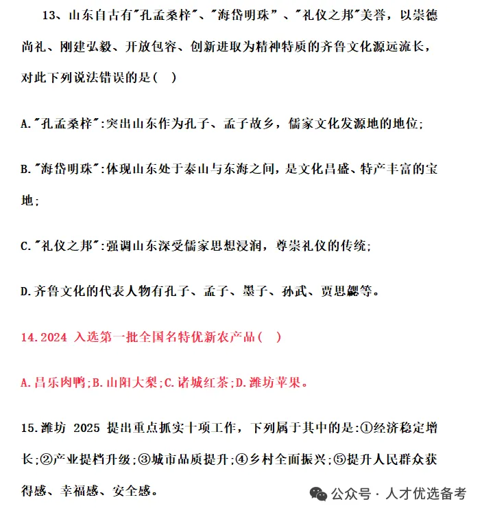 职测考察过程中针对山东省省情省况、潍坊市情市况考察多个题目,这就要求各位同学提前了解背诵!