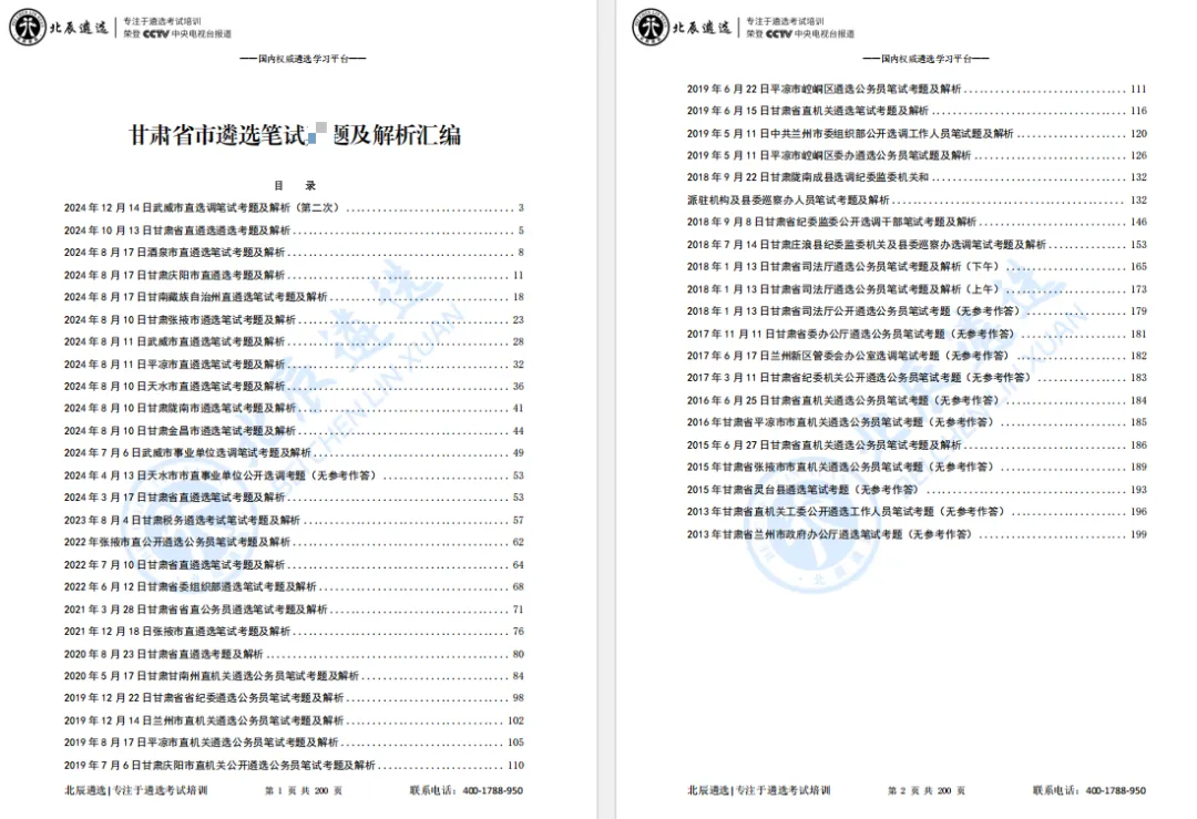 北辰整理《甘肃历年遴选笔试考题及解析汇编》,覆盖省内多市近年遴选笔试真题,精准匹配本地考试核心方向。