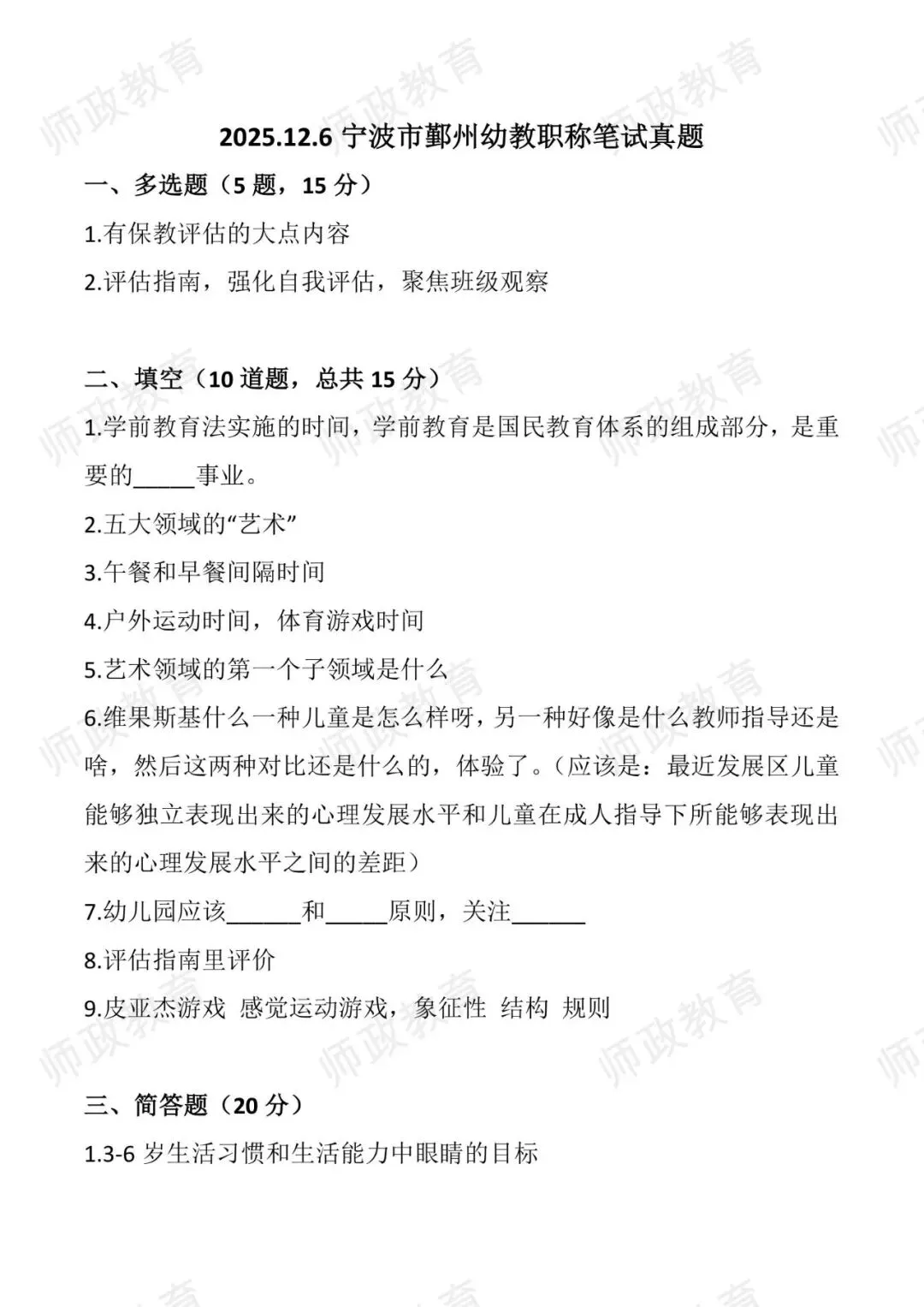 2025.12.6宁波市鄞州幼教职称笔试真题