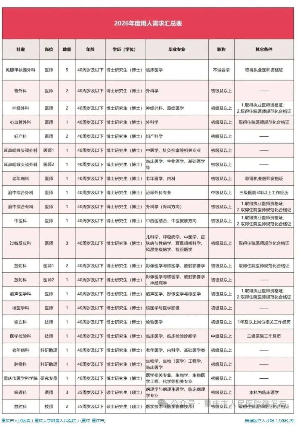 重庆市人民医院2026年招聘计划