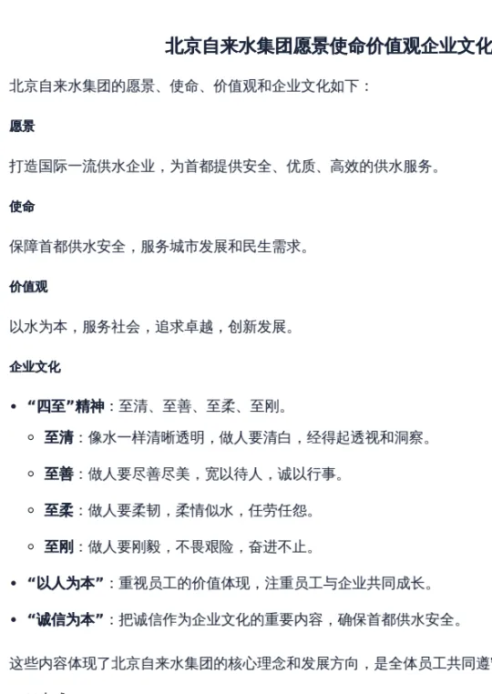集团当年重点工程:亦庄水厂二期、平谷应急水源连通、智慧水务 2.0 平台上线。题型为选择/判断,考前把集团官网“新闻中心”近 6 个月动态浏览一遍即可覆盖。