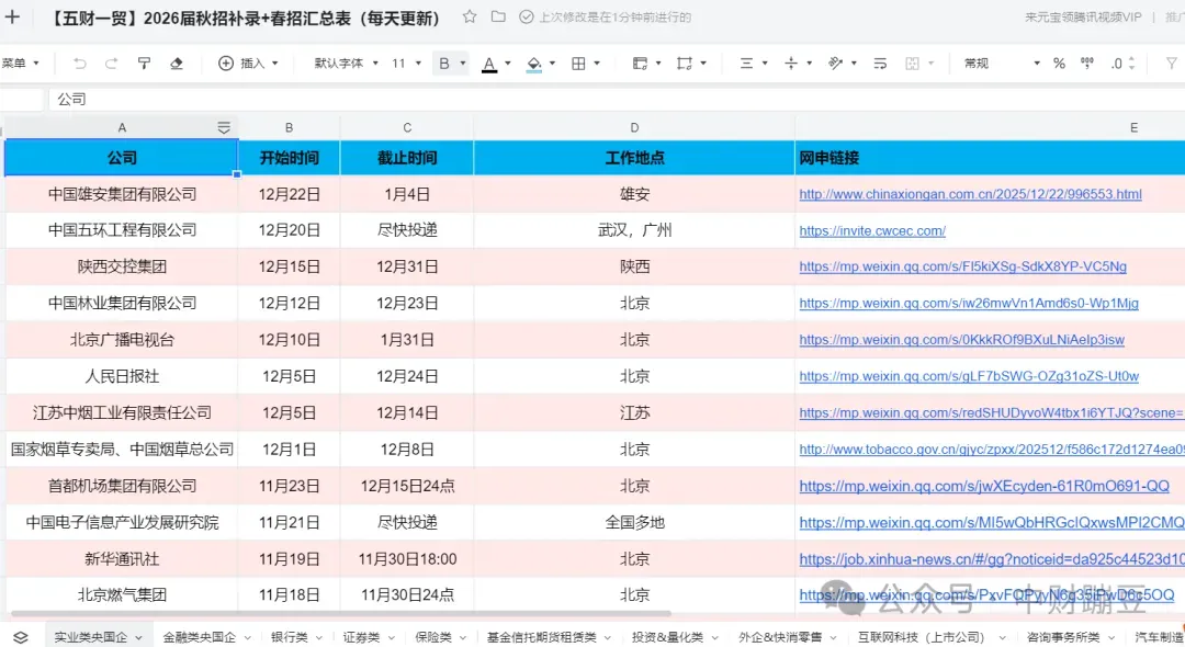 2026届学弟学妹们,秋招补录及春招求职关键期来袭!我整理了全行业秋招补录及春招网申汇总表(覆盖央国企(实业类|金融类)、金融(银行|券商|基金|信托|保险|金租)、投资量化类、互联网科技类、事务所咨询类、外企快消、汽车制造等多领域,含网申链接、开始截止时间),还组建了【26届秋招补录及春招信息及笔面试薪资交流群】在群内实时答疑笔面试经验、薪资户口政策,信息持续更新至2026年5月31日(覆盖补录+春招全周期),【26届秋招补录及春招网申汇总表+笔面试薪资交流群】仅需66元即可获得!