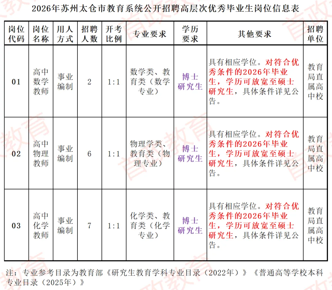 具体招聘岗位、人数及条件详见《2026年苏州太仓市教育系统公开招聘高层次优秀毕业生岗位信息表》(见附件,以下简称《岗位表》)。