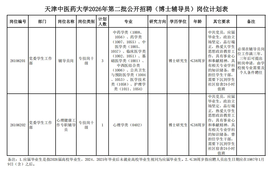 本招聘方案及计划有效期自发布之日起至2026年10月31日,具体招聘岗位见《天津中医药大学2026年第二批公开招聘(博士辅导员)岗位计划表》。