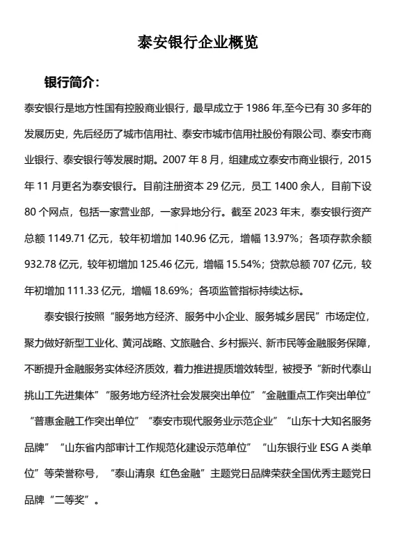 泰安银行特色:‑ 成立时间:1986 年,山东省首家地方法人城商行‑ 市场定位:服务地方经济、服务中小企业、服务城乡居民‑ 愿景:打造价值领先的现代精品银行‑ 价值观:诚信、稳健、创新、共赢‑ 2025 年 9 月末资产规模突破 1 800 亿元,存款余额 1 300 亿元题型为选择/判断,常考“哪项属于本行核心价值观”。